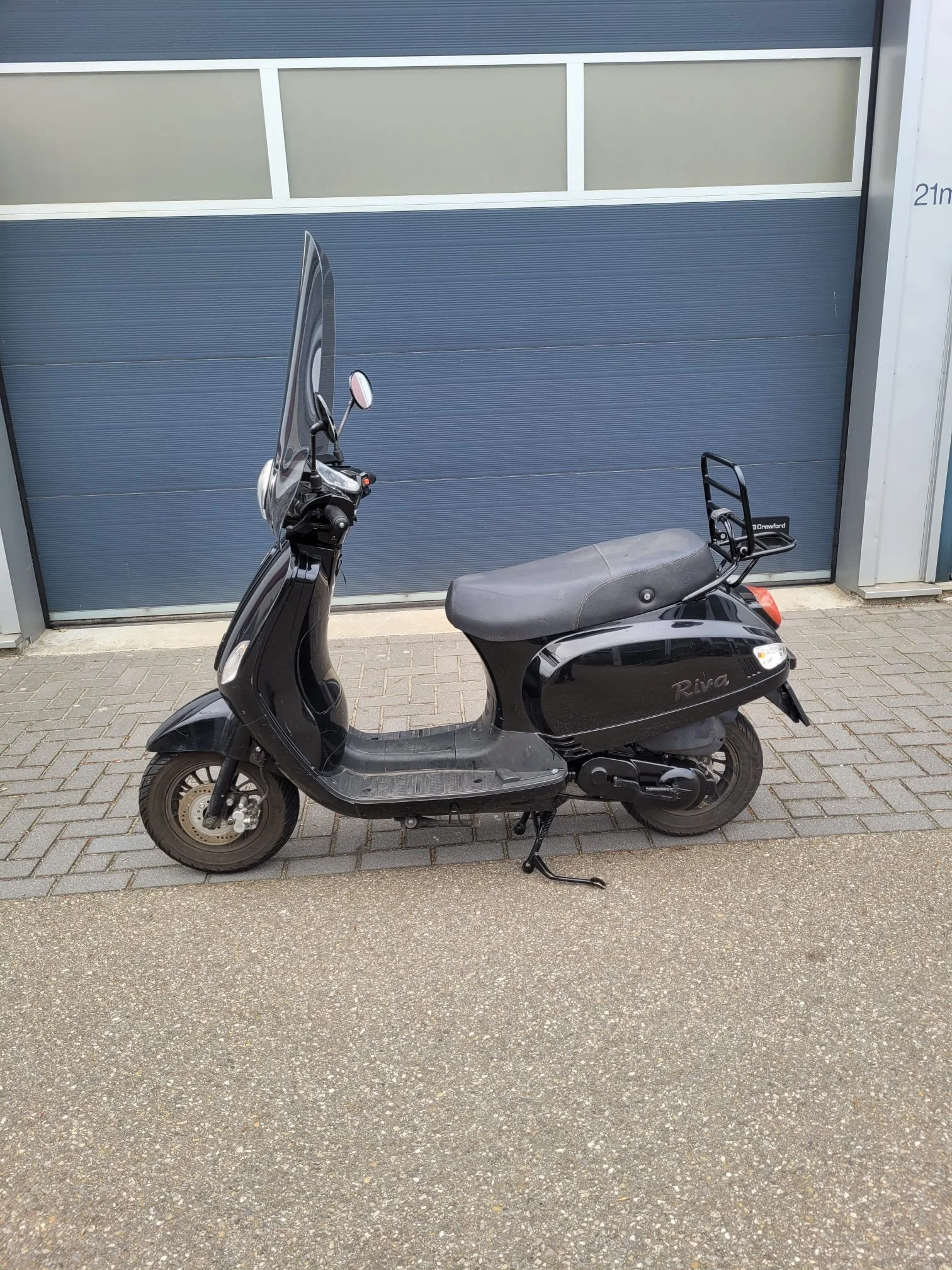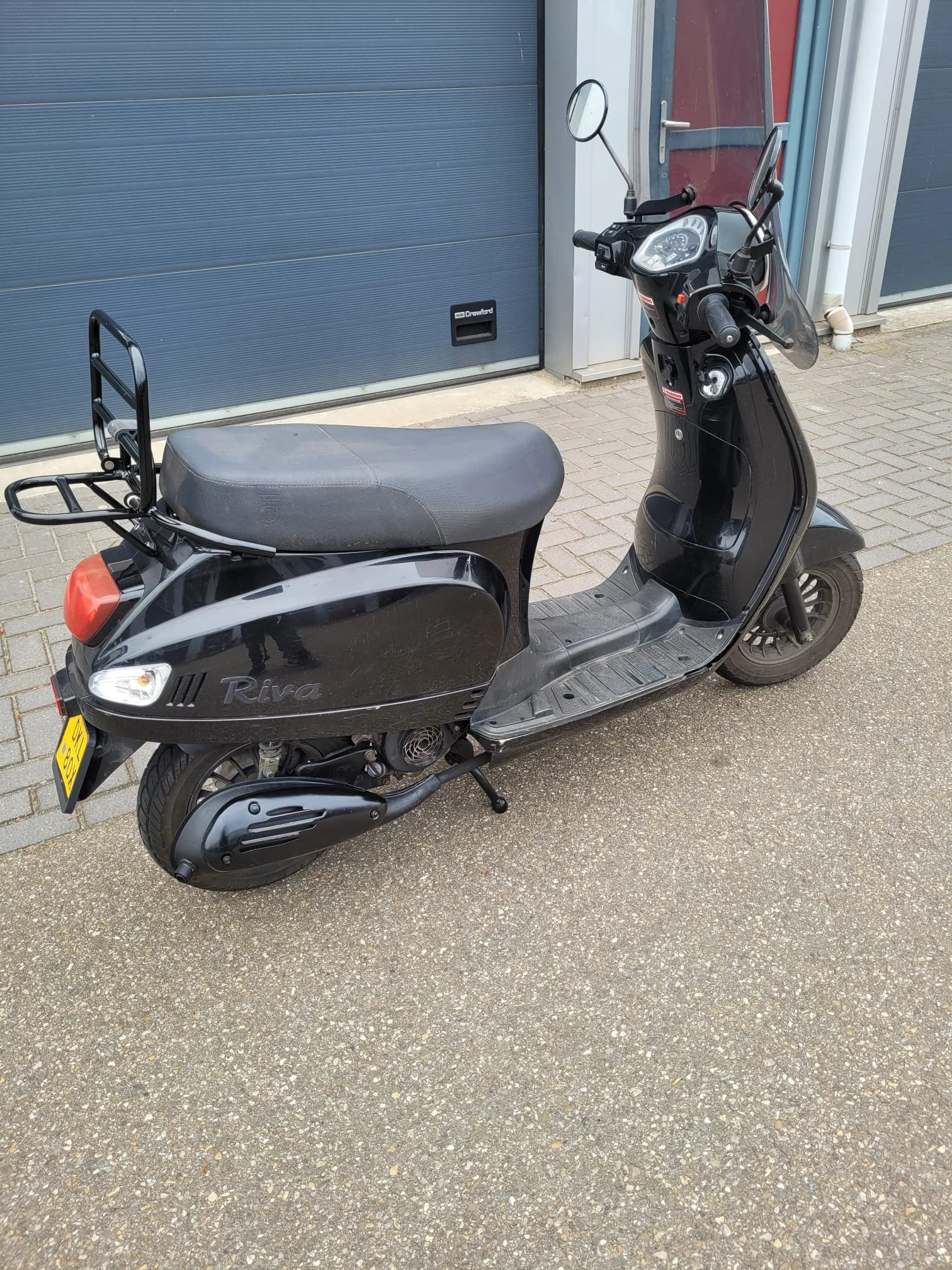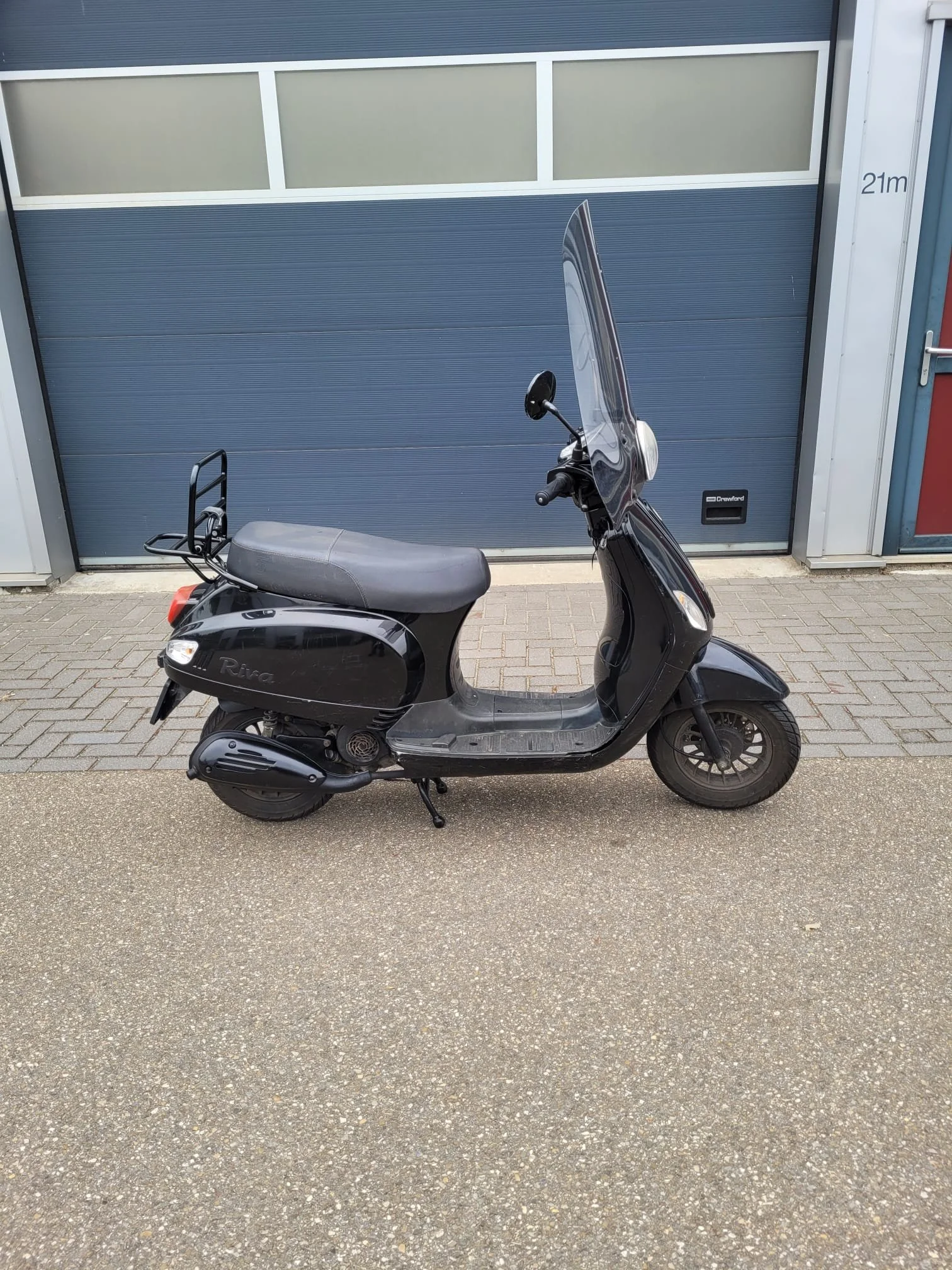 Een nette BTC Riva scooter in de kleur zwart. De scooter is gebruikt, maar in goede staat. Ideaal voor woon-werkverkeer of korte ritjes in de stad. Zie foto's voor details. Er is schade aan de treeplank.